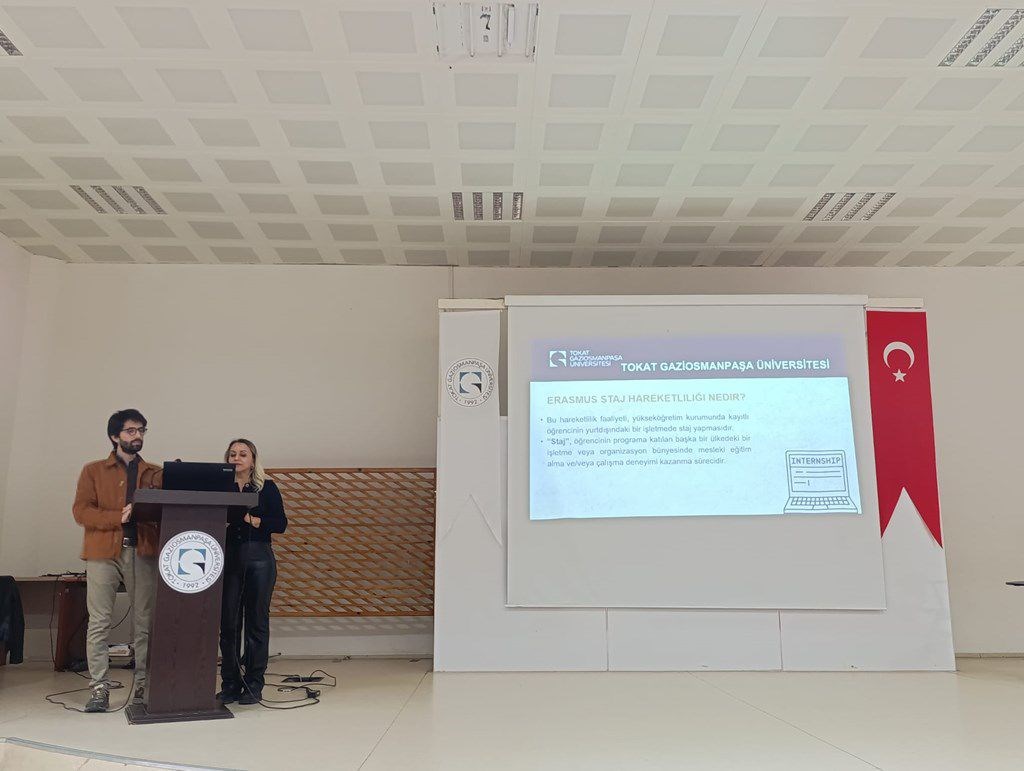 The session was conducted by Dr. Esengül U. Sayın, Coordinator for Internship Mobility, and Lect. Mert Güçlü, Coordinator for Learning Mobility. During the presentation, students were informed in detail about the scope and objectives of the Erasmus+ Programme, application procedures, selection criteria, grant opportunities, required documents, and the overall mobility process.