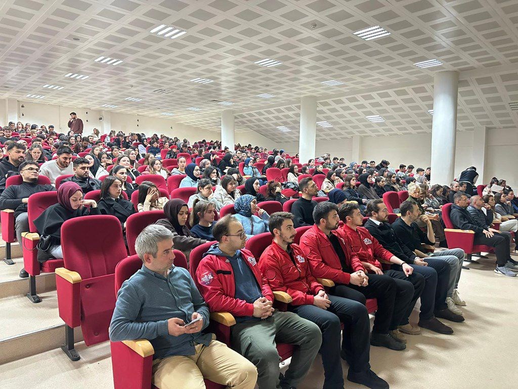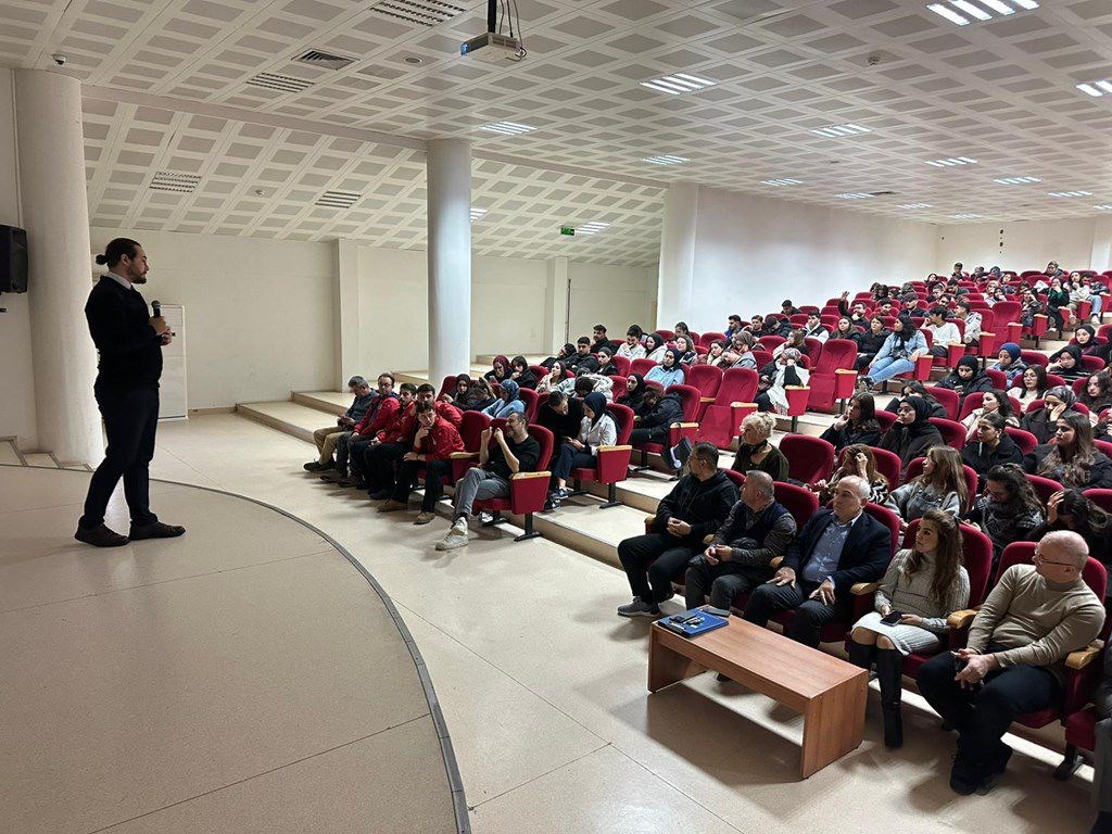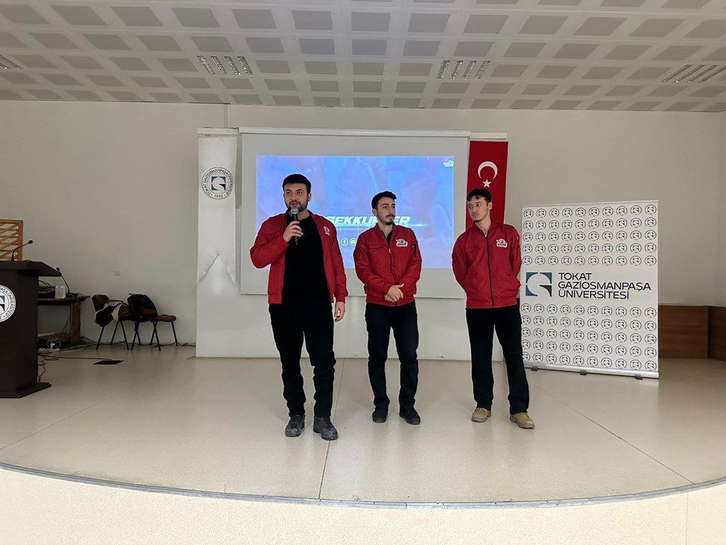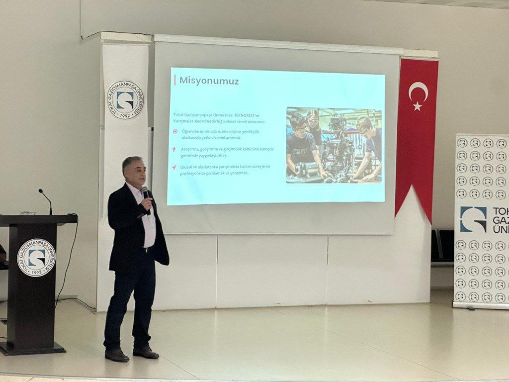 Organized by TEKNOFEST and Competitions Coordinator Assoc. Prof. Levent Gökrem and Deputy Coordinator Assist. Prof. Serhat Bilgin, the meeting provided detailed information on the scope of TEKNOFEST competitions, the 2026 application process, project development stages, and opportunities offered to participants. The event also featured presentations by Furkan Çetinkaya, T3 Foundation Tokat Provincial Representative, and members of the Protecta360 team, who won the Best Commercialization Potential Award and second place in the Smart Transportation Category at the 2025 TEKNOFEST. Presentations were delivered by Electrical and Electronics Engineering students Ahmet Zeki Aksoy, Emir Işık, Ömer Faruk Polat, and Mechanical Engineering student Muhammed Talha Kartal, highlighting successful projects from previous years and emphasizing TEKNOFEST’s role in encouraging young people to produce technology.
