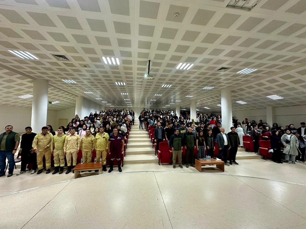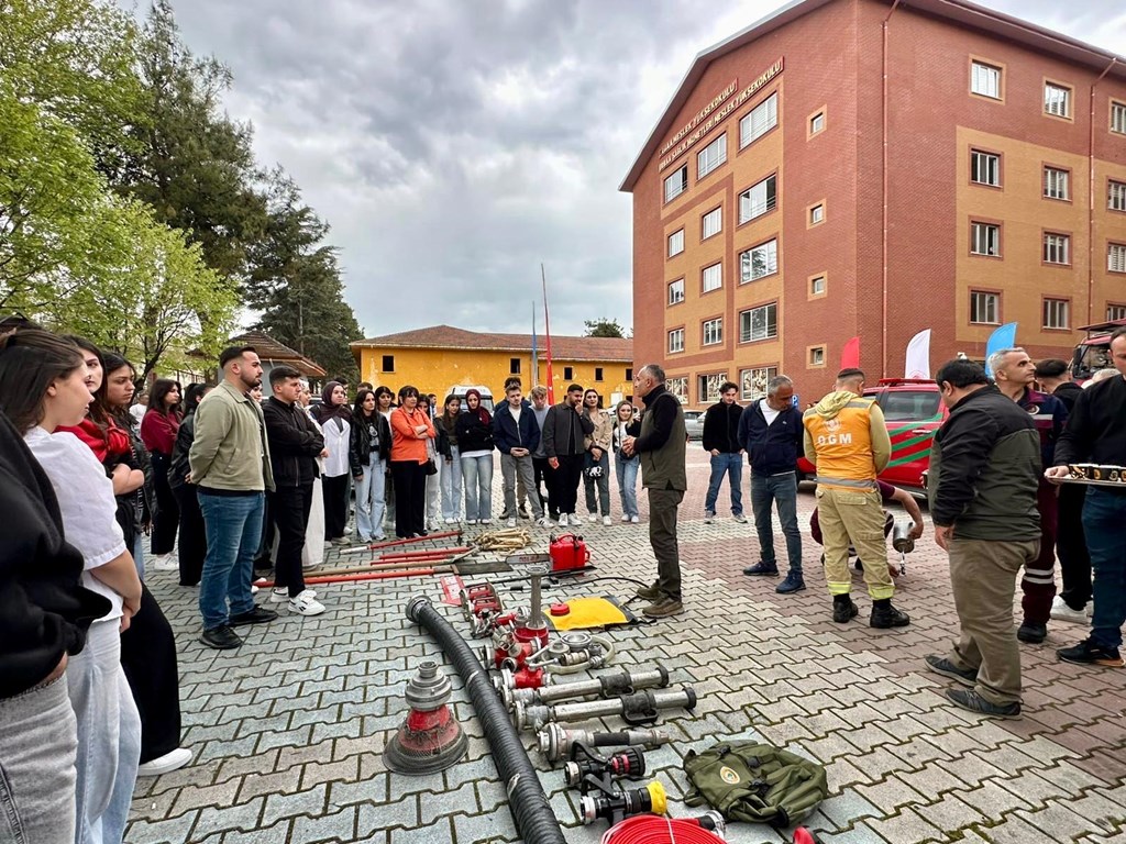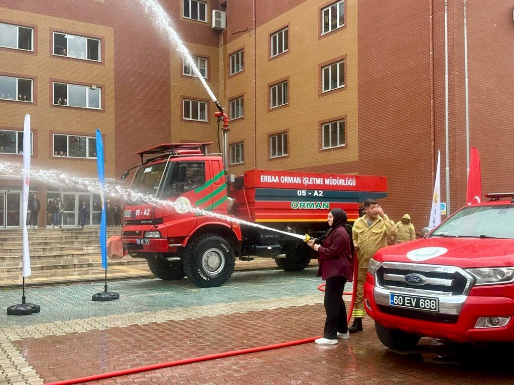 Program kapsamında yangınla mücadelede kullanılan arazözler, su ikmal araçları ve kişisel koruyucu donanımlar yerleşke bahçesinde tanıtılmış; katılımcılara ekipmanları yakından inceleme ve uygulamalı olarak deneyimleme imkânı sunulmuştur.